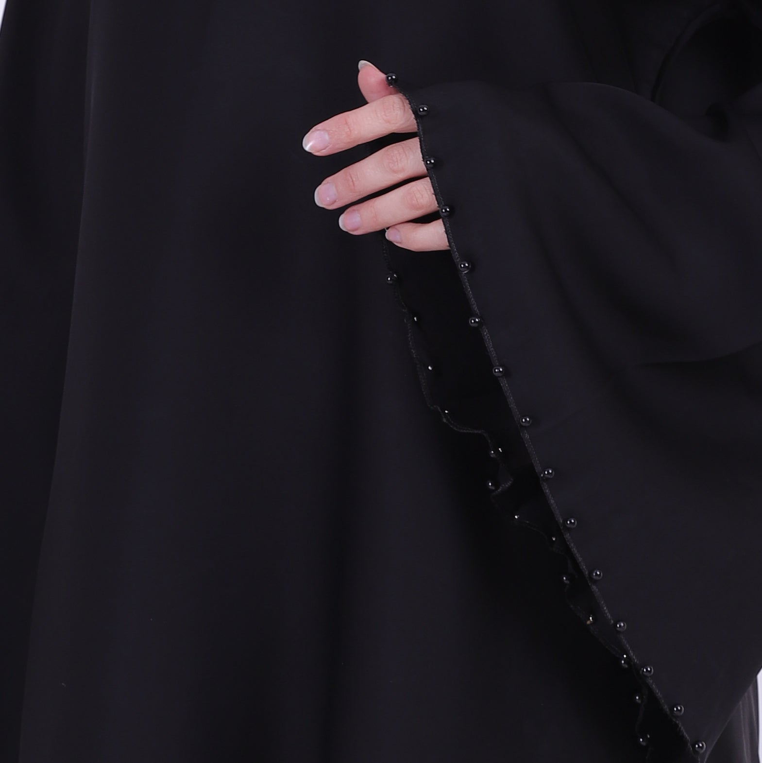 The abaya "cloak" (colloquially and more commonly, Arabicعباية‎ ʿabāyah, especially in Literary Arabicعباءة ʿabā'ah; plural عبايات ʿabāyātعباءات ʿabā'āt), sometimes also called an aba, is a simple, loose over-garment, essentially a robe-like dress, worn by some women in parts of the Muslim world including North East Africa, Somalia, Morocco, and the Arabian Peninsula.[1] Traditional abayat are black and may be either a large square of fabric draped from the shoulders or head or a long kaftan. The abaya covers the whole body except the head, feet, and hands. It can be worn with the niqāb, a face veil covering all but the eyes. Some women also wear long black gloves, so their hands are covered as well. It is common that the abaya is worn on special occasions, such as Mosque visits and Islamic Holiday celebrations for Eid al-Fitr and Eid al-Adha.